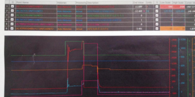 07:33:55巡检赶赴#2机励磁小间,发现室内烟气很重,线性电阻柜内部有明火,大量黑烟从柜顶冒出,组织运行人员同时拉开四个整流柜进出线刀闸,断开启励电源后灭火。DCS画面录波曲线如下(可发现跨接器电源在灭磁开关跳合后均没有上电)。