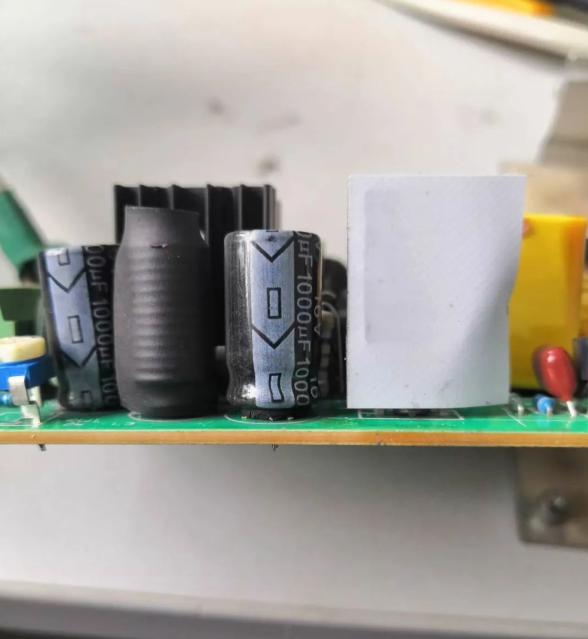 7、检查5V输出回路滤波电容,发现滤波电容底部胀鼓,说明电容损坏。(注意:电容有极性,更换时务必保证电容极性正确)